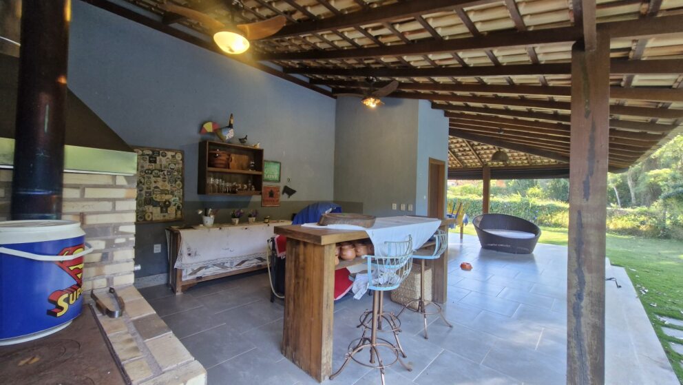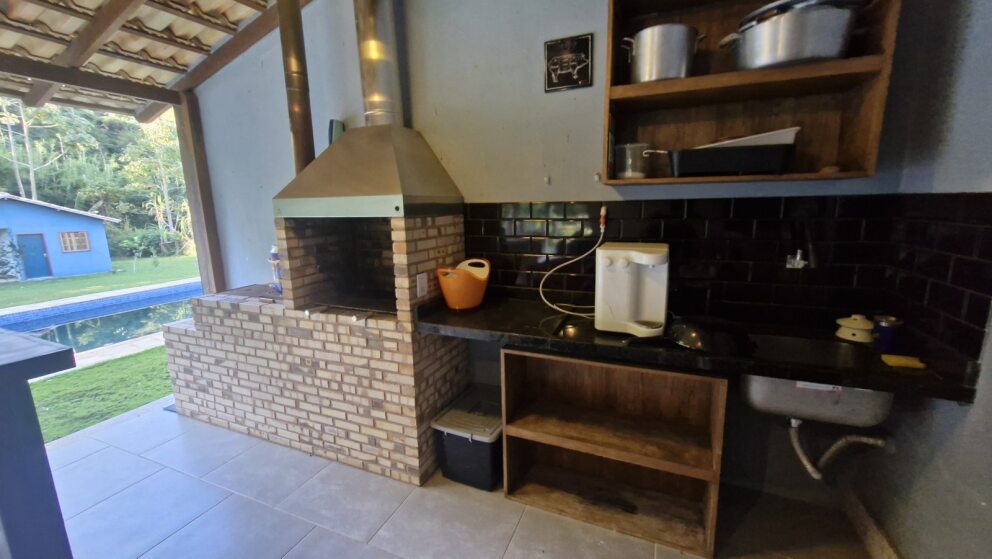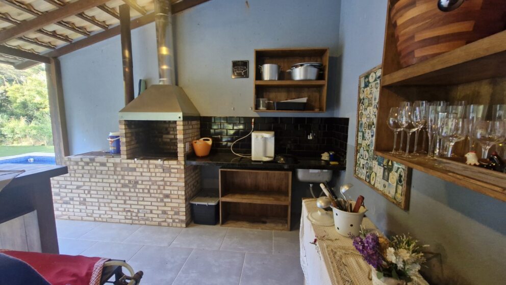 Área gourmet completa com churrasqueira, fogão a lenha e lavabo