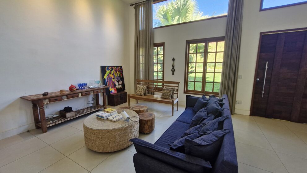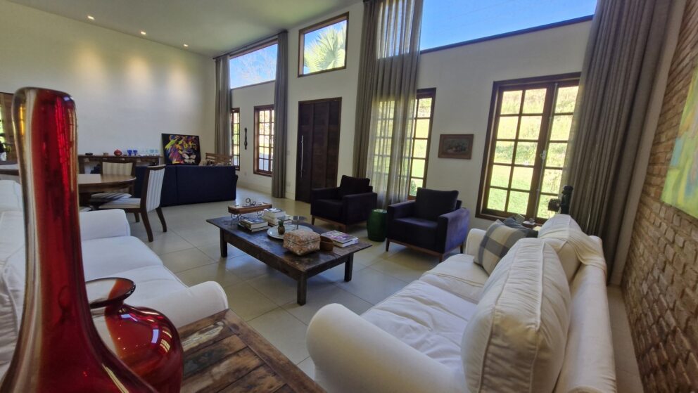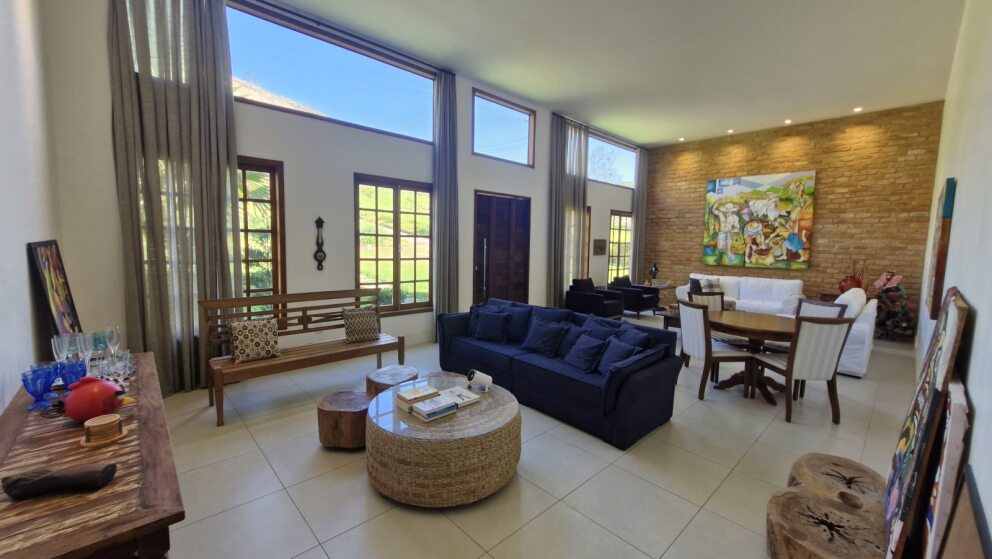 Sala ampla com pé-direito alto, dois ambientes e grandes janelas de vidro que garantem luminosidade natural e charme